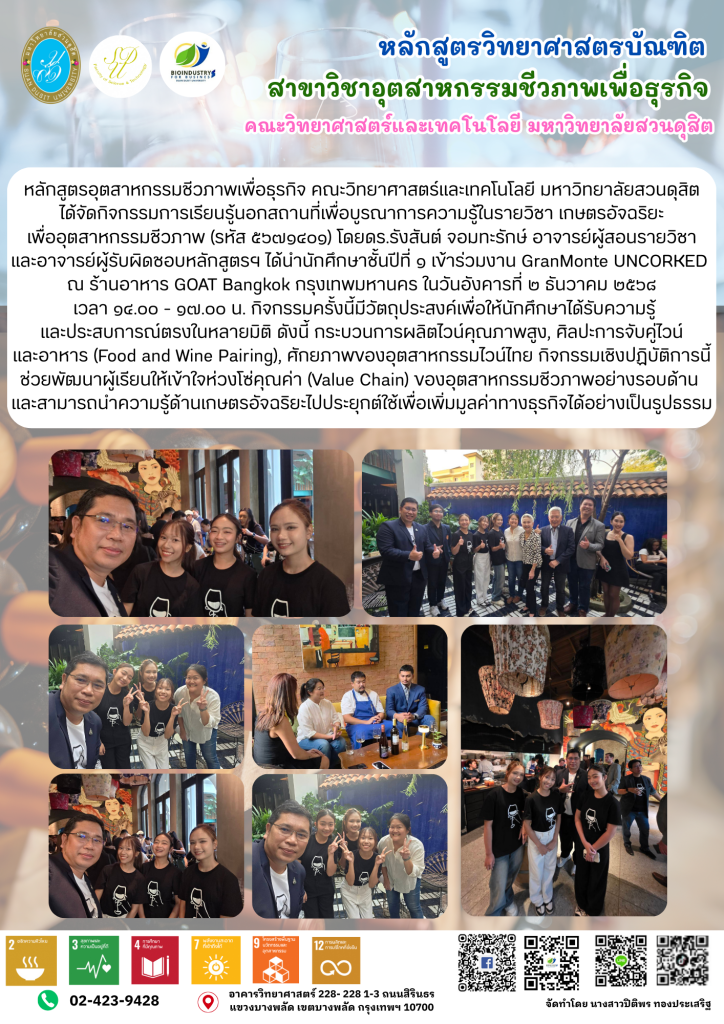 ได้จัดกิจกรรมการเรียนรู้นอกสถานที่เพื่อบูรณาการความรู้ในรายวิชา เกษตรอัจฉริยะเพื่ออุตสาหกรรมชีวภาพ โดยดร.รังสันต์ จอมทะรักษ์ อาจารย์ผู้สอนรายวิชาและอาจารย์ผู้รับผิดชอบหลักสูตรฯ ได้นำนักศึกษาชั้นปีที่ ๑ เข้าร่วมงาน GranMonte UNCORKED ณ ร้านอาหาร GOAT Bangkok กรุงเทพมหานคร ในวันอังคารที่ ๒ ธันวาคม ๒๕๖๘ เวลา ๑๔.๐๐ – ๑๗.๐๐ น. กิจกรรมครั้งนี้มีวัตถุประสงค์เพื่อให้นักศึกษาได้รับความรู้และประสบการณ์ตรงในหลายมิติ ดังนี้ กระบวนการผลิตไวน์คุณภาพสูง, ศิลปะการจับคู่ไวน์และอาหาร (Food and Wine Pairing), ศักยภาพของอุตสาหกรรมไวน์ไทย กิจกรรมเชิงปฏิบัติการนี้ช่วยพัฒนาผู้เรียนให้เข้าใจห่วงโซ่คุณค่า (Value Chain) ของอุตสาหกรรมชีวภาพอย่างรอบด้านและสามารถนำความรู้ด้านเกษตรอัจฉริยะไปประยุกต์ใช้เพื่อเพิ่มมูลค่าทางธุรกิจได้อย่างเป็นรูปธรรม