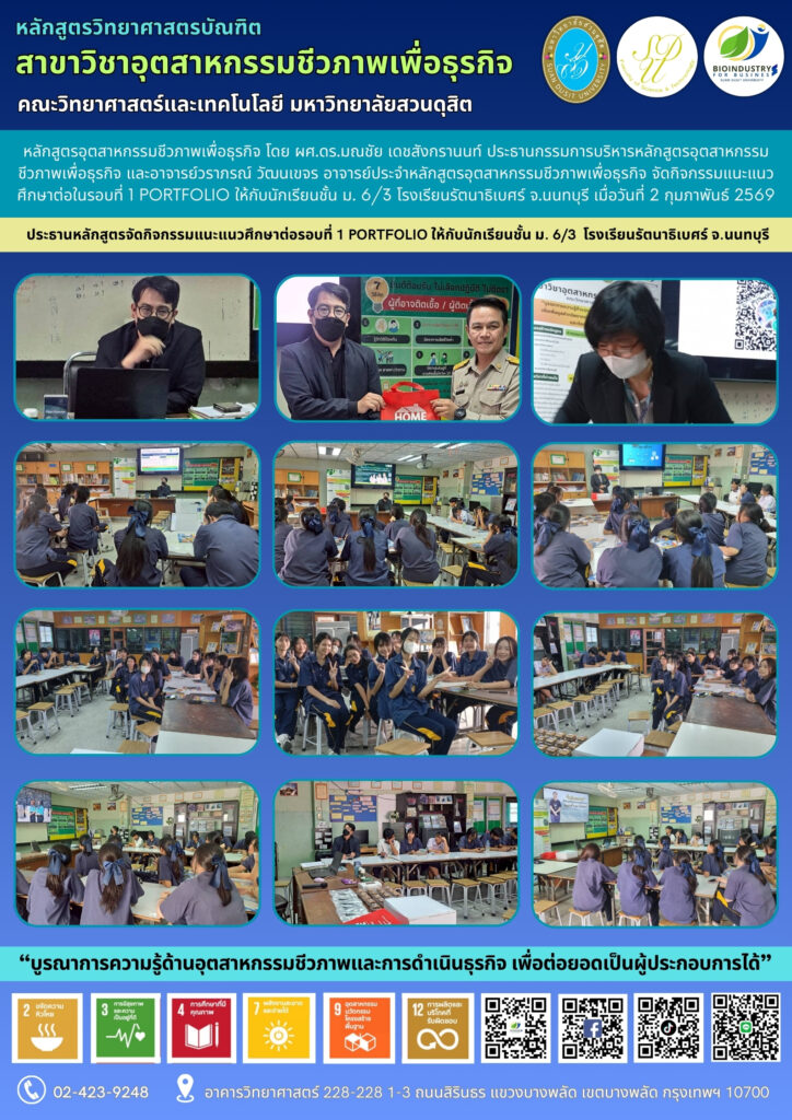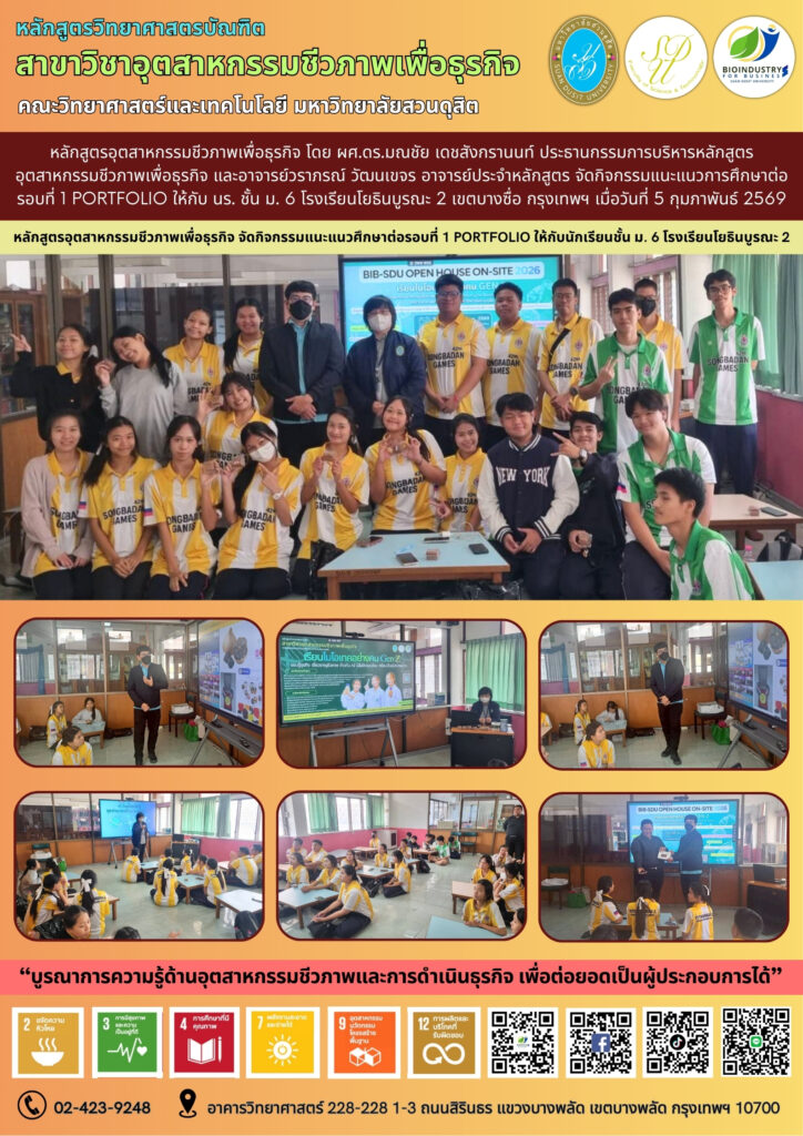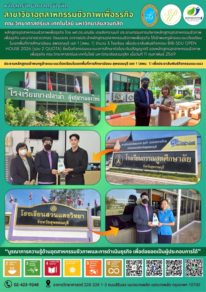 ผศ.ดร.มณชัย เดชสังกรานนท์ ประธานหลักสูตรอุตสาหกรรมชีวภาพเพื่อธุรกิจ พร้อมทั้งอาจารย์วราภรณ์ วัฒนเขจร ลงพื้นที่เข้าประชาสัมพันธ์หลักสูตรแก่นักเรียนชั้นมัธยมศึกษาปีที่ 5 และมัธยมศึกษาปีที่ 6 ในโรงเรียนเขตพื้นที่กรุงเทพมหานครและปริมณฑล เพื่อเป็นการโปรโมทหลักสูตรให้เป็นที่รู้จักมากยิ่งขึ้น