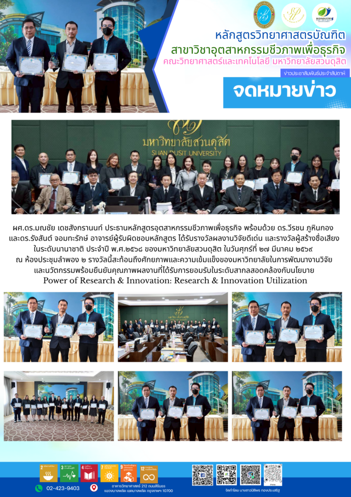 ผศ.ดร.มณชัย เดชสังกรานนท์ ประธานหลักสูตรอุตสาหกรรมชีวภาพเพื่อธุรกิจ พร้อมด้วย ดร.วีรชน ภูหินกอง และดร.รังสันต์ จอมทะรักษ์ อาจารย์ผู้รับผิดชอบหลักสูตร ได้รับรางวัลผลงานวิจัยดีเด่น และรางวัลผู้สร้างชื่อเสียง ในระดับนานาชาติ ประจำปี พ.ศ.๒๕๖๘ ของมหาวิทยาลัยสวนดุสิต ในวันศุกร์ที่ ๒๗ มีนาคม ๒๕๖๙ ณ ห้องประชุมลำพอง ๒ รางวัลนี้สะท้อนถึงศักยภาพและความเข้มแข็งของมหาวิทยาลัยในการพัฒนางานวิจัย และนวัตกรรมพร้อมยืนยันคุณภาพผลงานที่ได้รับการยอมรับในระดับสากลสอดคล้องกับนโยบาย Power of Research & Innovation: Research & Innovation Utilization