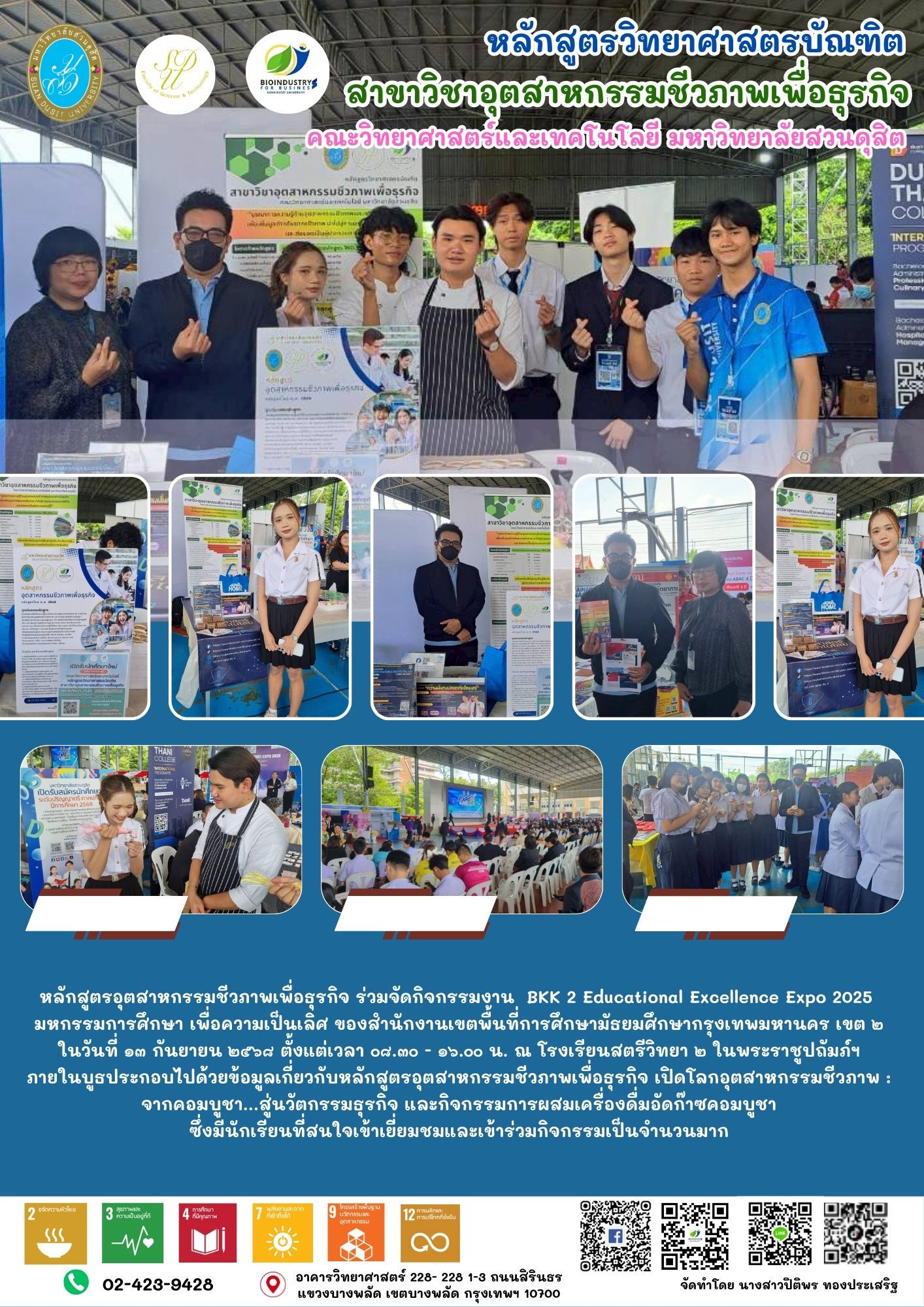 หลักสูตรอุตสาหกรรมชีวภาพเพื่อธุรกิจ ร่วมจัดกิจกรรมงาน BKK 2 Educational Excellence Expo 2025มหกรรมการศึกษา เพื่อความเป็นเลิศ ของสำนักงานเขตพื้นที่การศึกษามัธยมศึกษากรุงเทพมหานคร เขต ๒ ในวันที่ ๑๓ กันยายน ๒๕๖๘ ตั้งแต่เวลา ๐๘.๓๐ – ๑๖.๐๐ น. ณ โรงเรียนสตรีวิทยา ๒ ในพระราชูปถัมภ์ฯ ภายในบูธประกอบไปด้วยข้อมูลเกี่ยวกับหลักสูตรอุตสาหกรรมชีวภาพเพื่อธุรกิจ เปิดโลกอุตสาหกรรมชีวภาพ : จากคอมบูชา…สู่นวัตกรรมธุรกิจ และกิจกรรมการผสมเครื่องดื่มอัดก๊าซคอมบูชา ซึ่งมีนักเรียนที่สนใจเข้าเยี่ยมชมและเข้าร่วมกิจกรรมเป็นจำนวนมาก