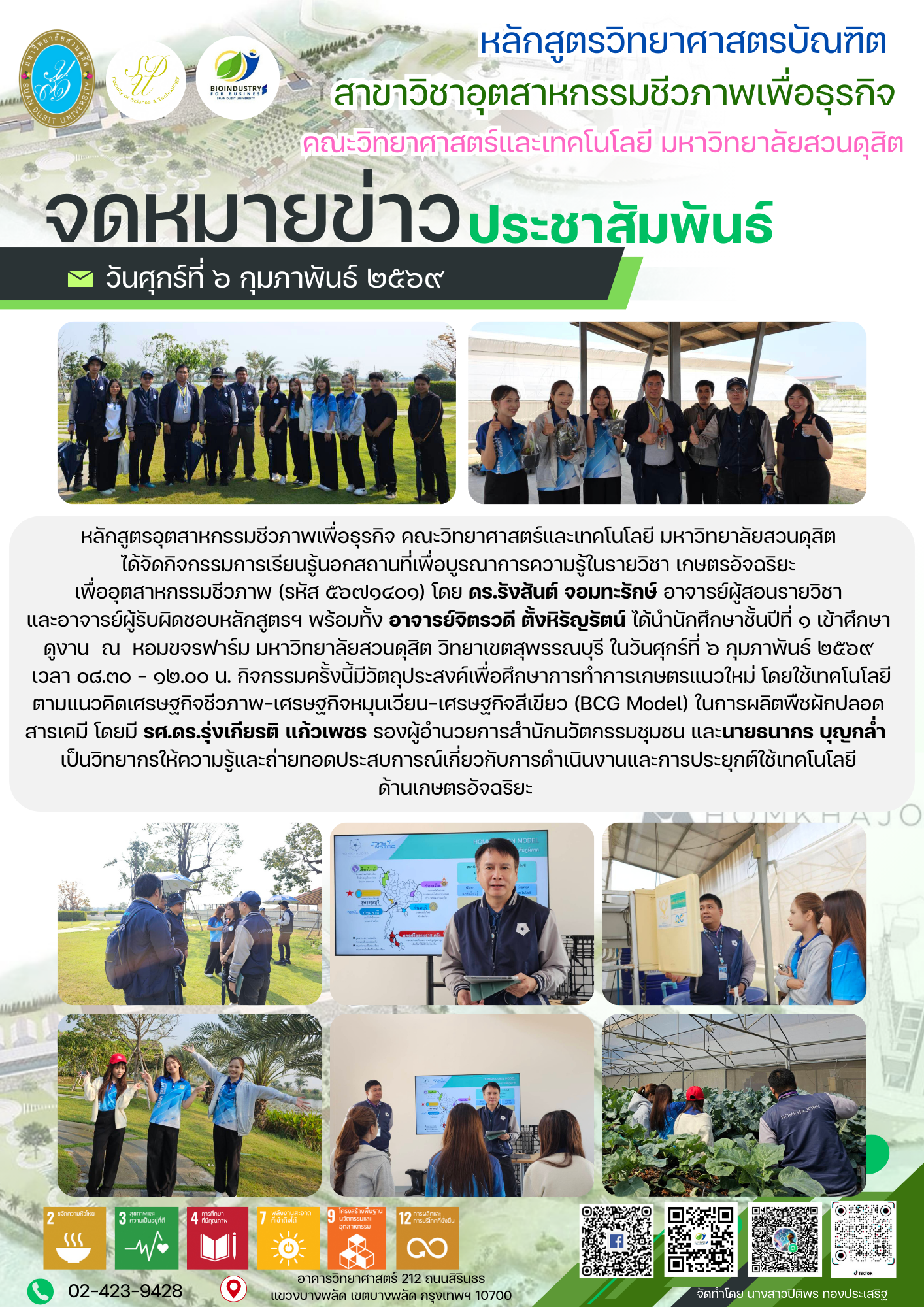 หลักสูตรอุตสาหกรรมชีวภาพเพื่อธุรกิจ คณะวิทยาศาสตร์และเทคโนโลยี มหาวิทยาลัยสวนดุสิต ได้จัดกิจกรรมการเรียนรู้นอกสถานที่เพื่อบูรณาการความรู้ในรายวิชา เกษตรอัจฉริยะเพื่ออุตสาหกรรมชีวภาพ (รหัส ๕๖๗๑๔๐๑) โดย ดร.รังสันต์ จอมทะรักษ์ อาจารย์ผู้สอนรายวิชาและอาจารย์ผู้รับผิดชอบหลักสูตรฯ พร้อมทั้ง อาจารย์จิตรวดี ตั้งหิรัญรัตน์ ได้นำนักศึกษาชั้นปีที่ ๑ เข้าศึกษาดูงาน ณ หอมขจรฟาร์ม มหาวิทยาลัยสวนดุสิต วิทยาเขตสุพรรณบุรี ในวันศุกร์ที่ ๖ กุมภาพันธ์ ๒๕๖๙เวลา ๐๘.๓๐ – ๑๒.๐๐ น. กิจกรรมครั้งนี้มีวัตถุประสงค์เพื่อศึกษาการทำการเกษตรแนวใหม่ โดยใช้เทคโนโลยีตามแนวคิดเศรษฐกิจชีวภาพ–เศรษฐกิจหมุนเวียน–เศรษฐกิจสีเขียว (BCG Model) ในการผลิตพืชผักปลอดสารเคมี โดยมี รศ.ดร.รุ่งเกียรติ แก้วเพชร รองผู้อำนวยการสำนักนวัตกรรมชุมชน และนายธนากร บุญกล่ำเป็นวิทยากรให้ความรู้และถ่ายทอดประสบการณ์เกี่ยวกับการดำเนินงานและการประยุกต์ใช้เทคโนโลยีด้านเกษตรอัจฉริยะ