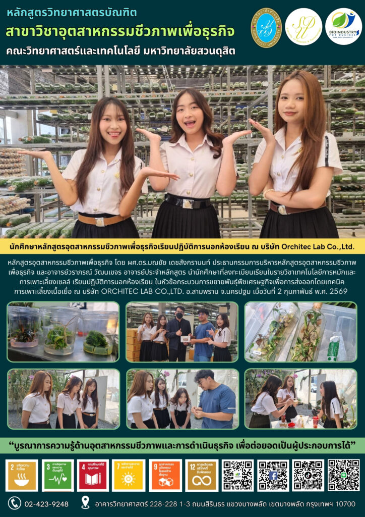 หลักสูตรอุตสาหกรรมชีวภาพเพื่อธุรกิจ โดย ผศ.ดร.มณชัย เดชสังกรานนท์ ประธานหลักสูตรอุตสาหกรรมชีวภาพเพื่อธุรกิจ และอาจารย์วราภรณ์ วัฒนเขจร อาจารย์ประจำหลักสูตร นำนักศึกษาที่ลงทะเบียนในรายวิชาเทคโนโลยีการหมักและการเพาะเลี้ยงเซลล์ เรียนปฎิบัติการนอกห้องเรียน ในหัวข้อกระบวนการขยายพันธุ์พืชเศรษฐกิจเพื่อการส่งออกโดยเทคนิคการเพาะเลี้ยงเนื้อเยื้อ ณ บริษัท ออร์คิเทค แลบ จำกัด จังหวัดนครปฐม วันจันทร์ที่ ๒ กุมภาพันธ์ ๒๕๖๙ เวลา ๑๓.๐๐ – ๑๗.๐๐ น.