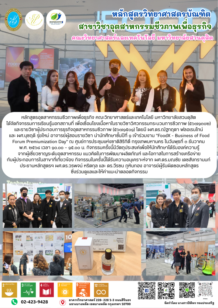 หลักสูตรอุตสาหกรรมชีวภาพเพื่อธุรกิจ คณะวิทยาศาสตร์และเทคโนโลยี มหาวิทยาลัยสวนดุสิต นำนักศึกษาชั้นปีที่ 1 เข้าร่วมกิจกรรม “FoodX – Business of Food Forum Premiumization Day”